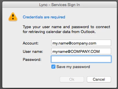 Once these entries are deleted open Lync again and sign in at the main window using username@company.com as the User ID and you will no longer get the second login prompt. If you check the "Remember my password" box here it will save the correct credentials to your Keychain.