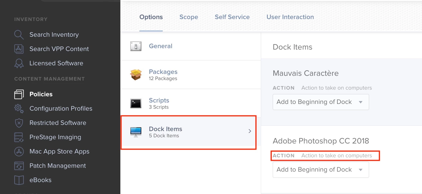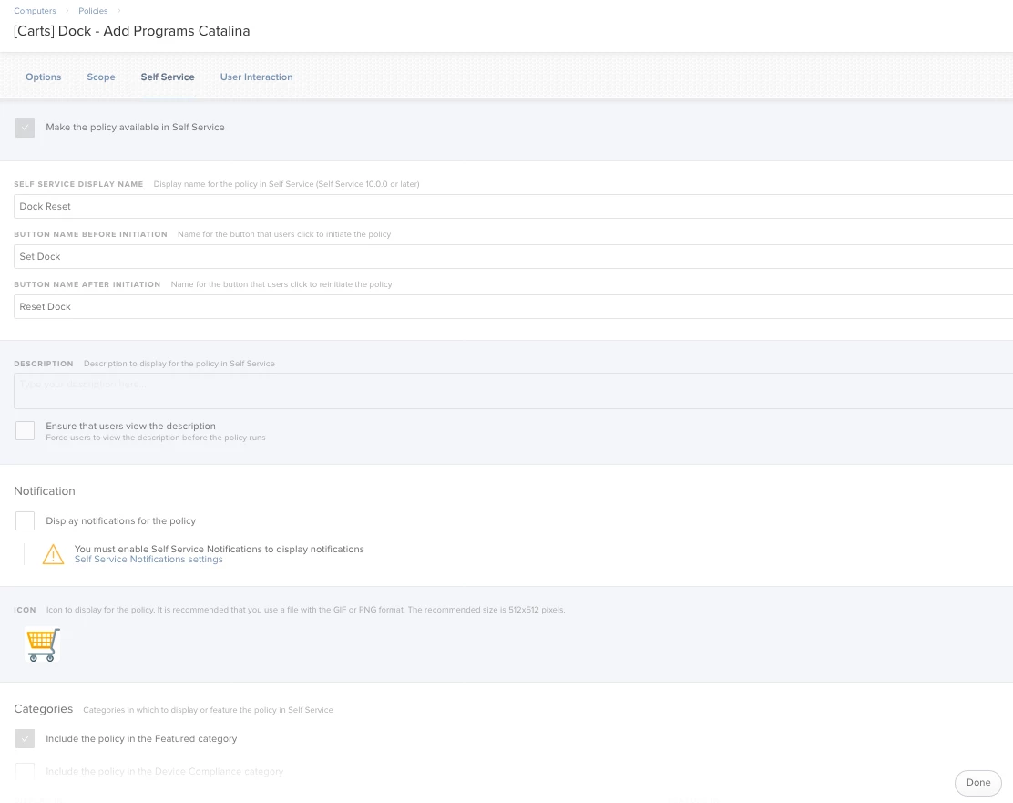 However from High Sierra, we use Policies that our IT support team triggers via the self service in order to install application profiles with shortcut in the Dock.