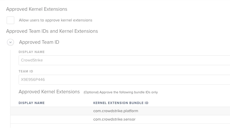 @PhillyPhoto you specifically mentioned Crowdstrike and Symantec, and those are the two applications that I'm most concerned with in terms of KEXTs. I created a Configuration Profile in JSS 10.2.2 (we've since upgraded to 10.3.1) for approved KEXTs and entered the following: