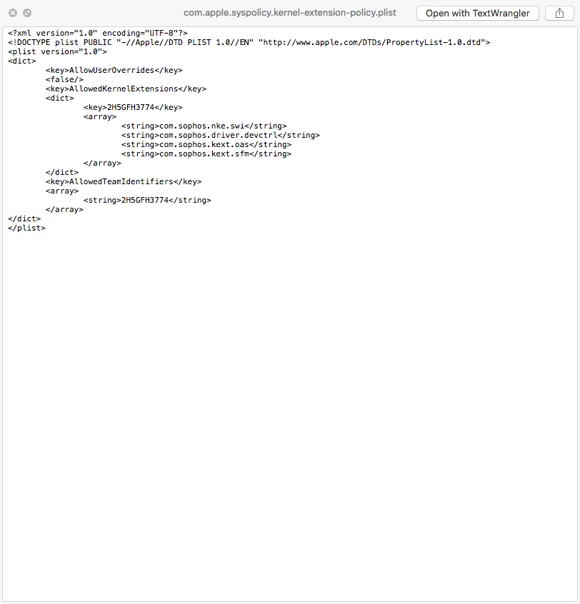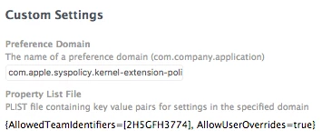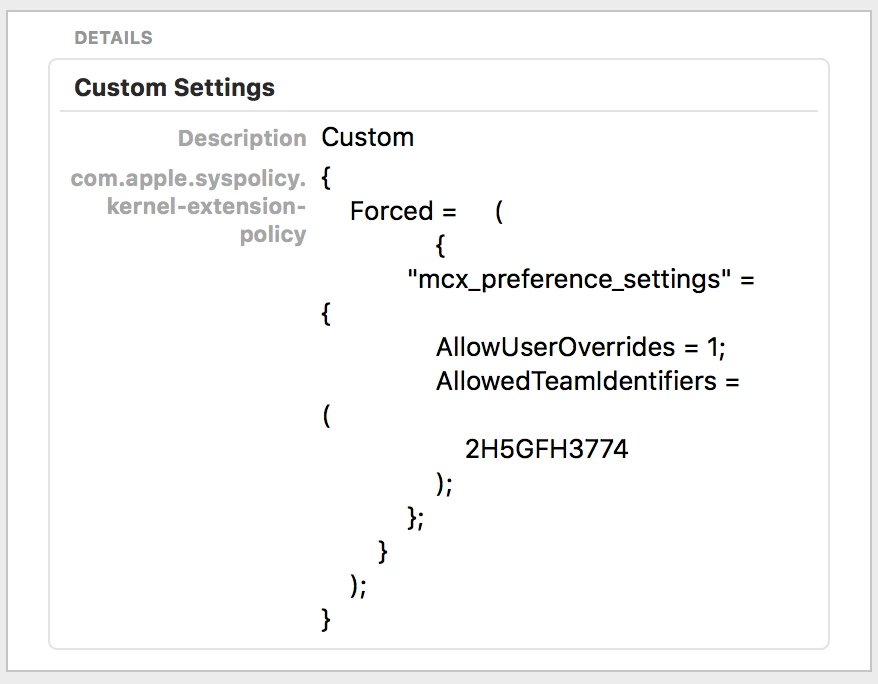 However for those still on 9.101 (I am for a few more weeks (long story)) I've tried the Custom Payload method and not having any luck, tried using the Team ID only (preferable it seems) and even the Team ID+Bundle IDs method to test, toggled AllowUserOverrides true/false, ensured the domain is com.apple.syspolicy.kernel-extension-policy ... and still getting a pop-up to Allow the kext on a Mac with a User Accepted MDM Mac and the CP installed prior to installation of the kext (Sophos and Parallels)
