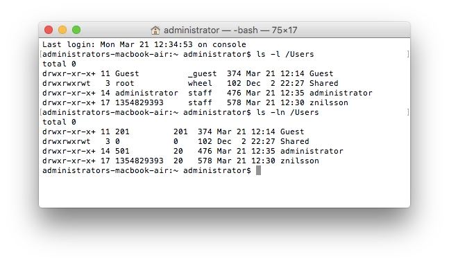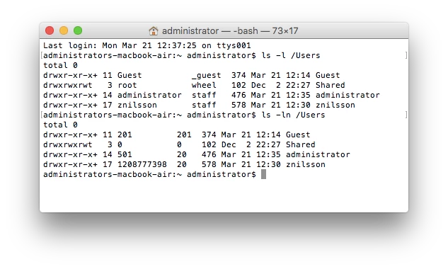 drwxr-xr-x+ 25 znilsson staff 850 Mar 18 14:31 znilsson