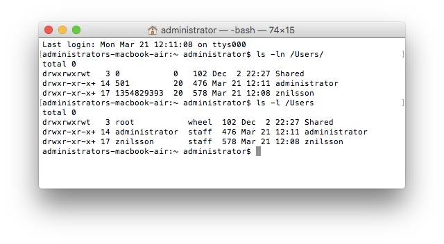 Note that with ls -l my home directory is again showing my username, and ls -ln shows that it has a new UID, indicating that the permission/AD merge process was completed successfully. At this point I can log out of the admin account and log in as myself, and everything works fine.