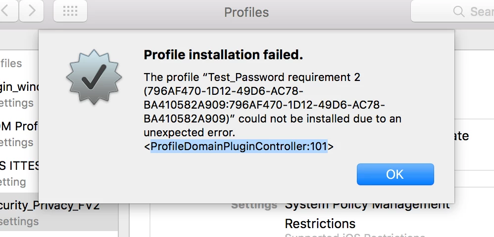 i found no new profile deployed on my mac. i did refresh all mdm profiles by running ‘jamf removemdmprofile and jamf mdm’, all the other profiles installed immediately, except the passcode test profile