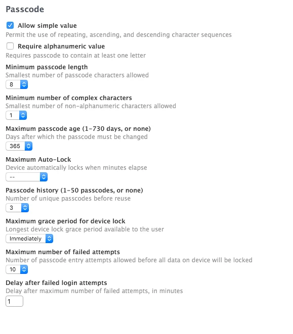 - Input passcode session, checked options like Require alphanumeric value, maximum auto-lock
