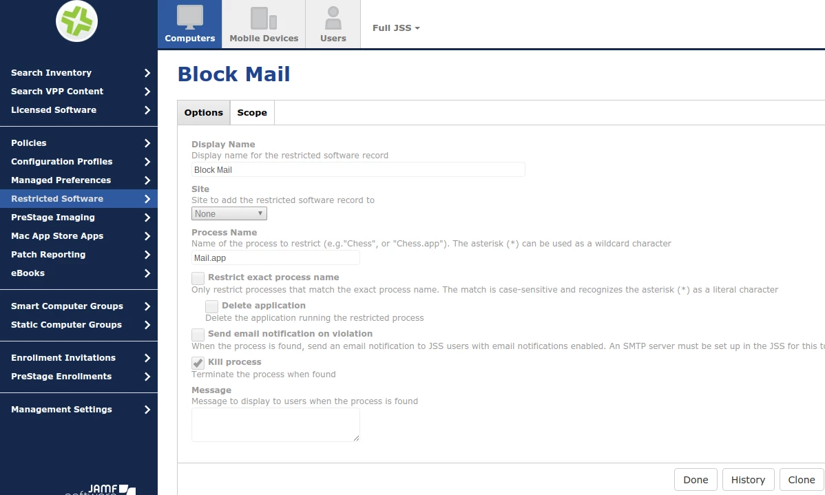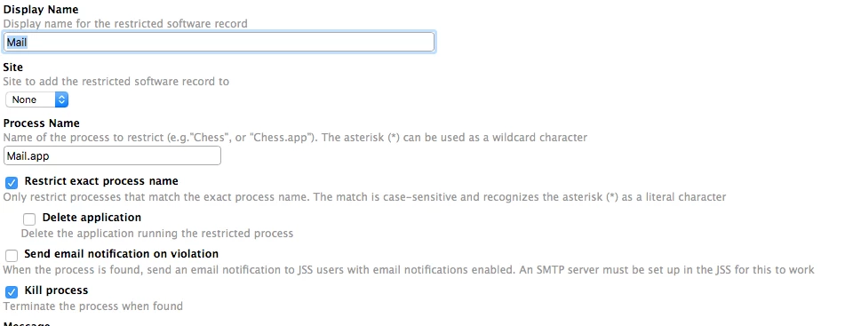 Is Mail actually starting up? I have Apple Mail set as restricted software on our student computers. I originally had a dialogue box pop up whenever the process was killed informing the students to use the browser to access their emails, but due to the process being found 2-3 times during boot I now just have the process killed. All of our student computers are on 10.11 currently. I haven't found any issues just killing the app this way. Am I missing something about your question? I'll attach a screenshot of my configuration if that helps.