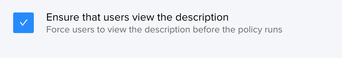 Issue is that one policy DOES show the description, and one does not. We have specific text in the description telling users to cancel if they do not agree to the terms, so it IS important that they see it. Any clue why one would work and the other not? Again, the one working was cloned from the one which is now not working, and works as expected.
