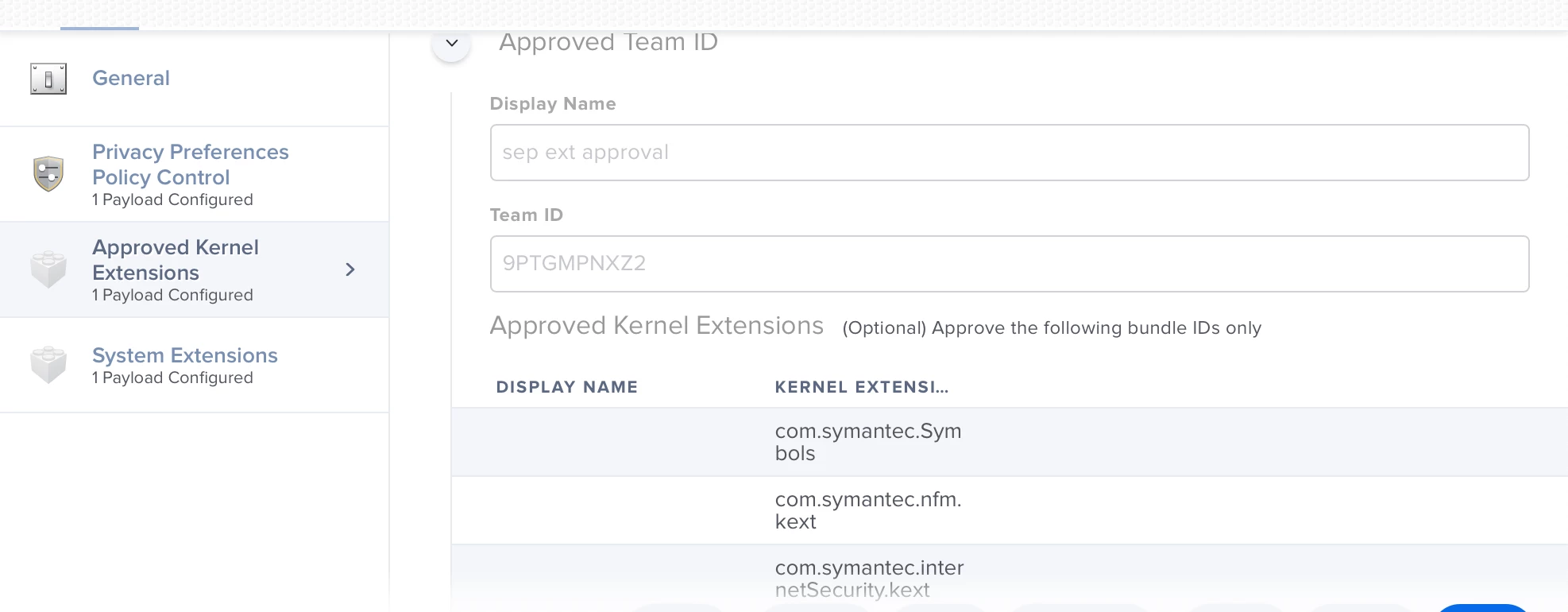 I did configure Team ID of Symantec in Approved Kernel Extension payload of a config profile but no luck