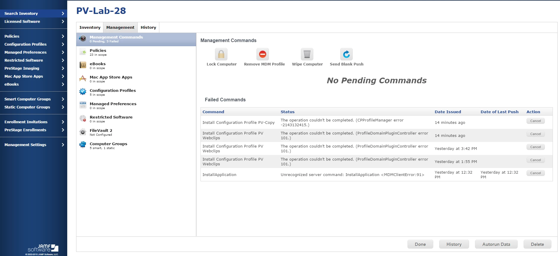 I've been trying to push out some configuration profiles to a freshly imaged mac lab. The only thing in the profile is a few webclips that are supposed to show up on the dock. I'm having this problem at all of our labs but this lab specifically I logged into the whole lab with ARD and watched all the icons show up on the dock and then immediately disappear, which is a little frustrating. The picture is of the errors I'm getting on the whole lab.