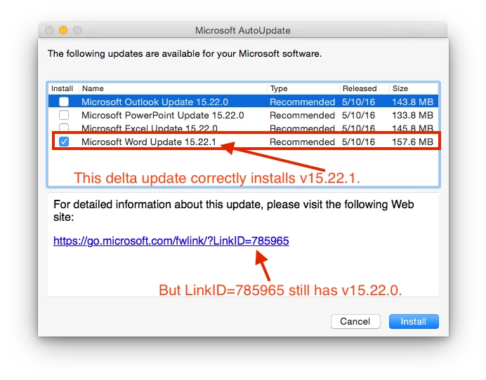 Note that KB3155777 has not been updated — its direct download link still points to v15.22.0