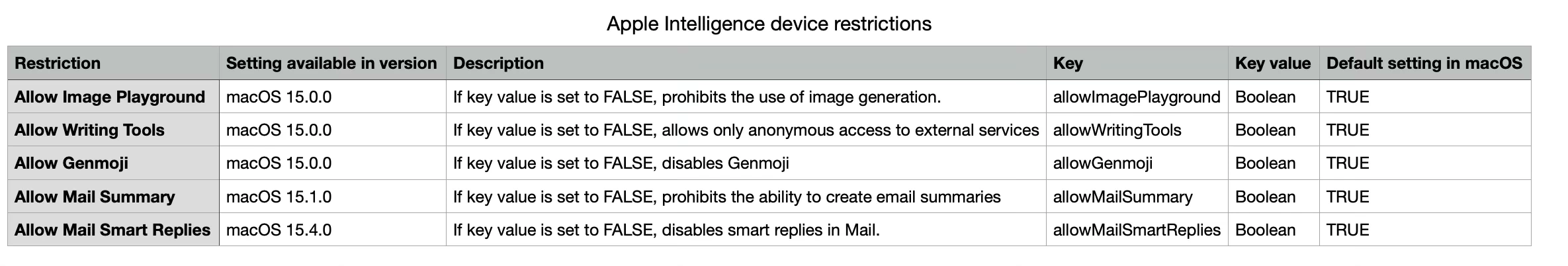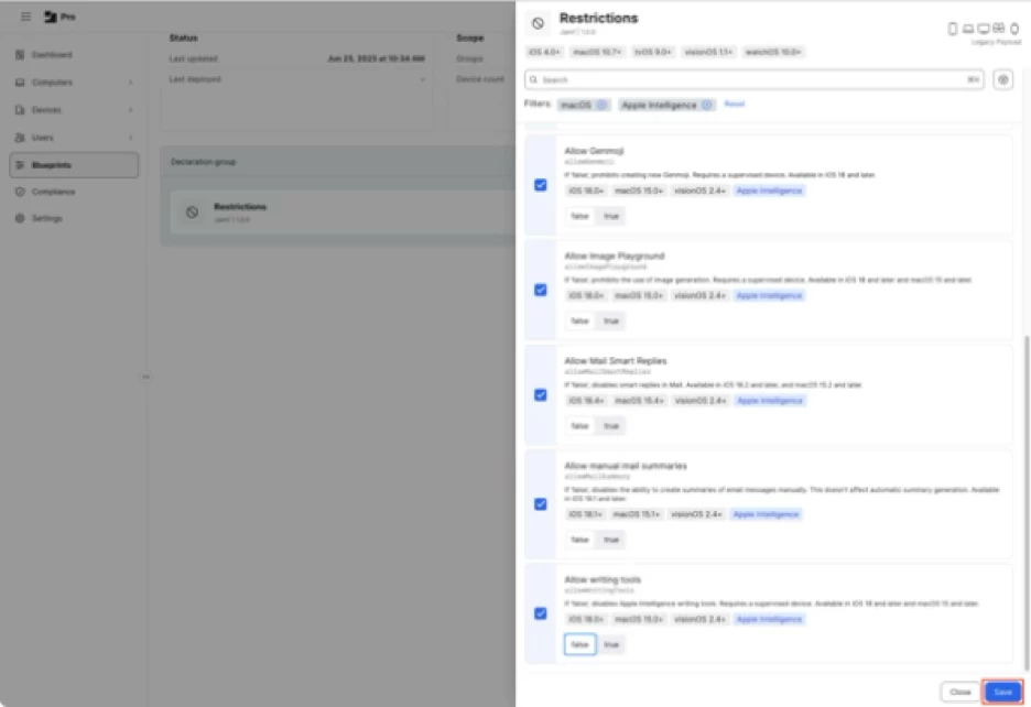 Let’s see how this works using a device restriction configuration, using the example of setting the following Apple Intelligence management functions to false in order to block the corresponding Apple Intelligence functions on macOS: