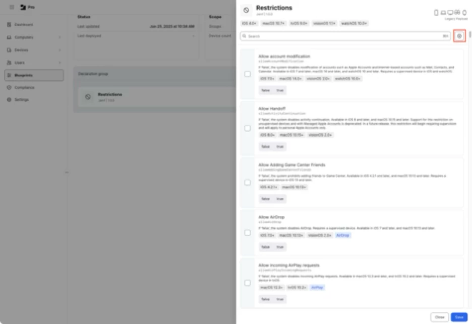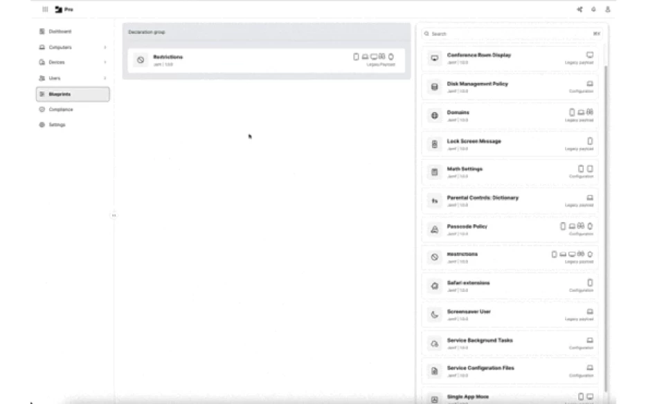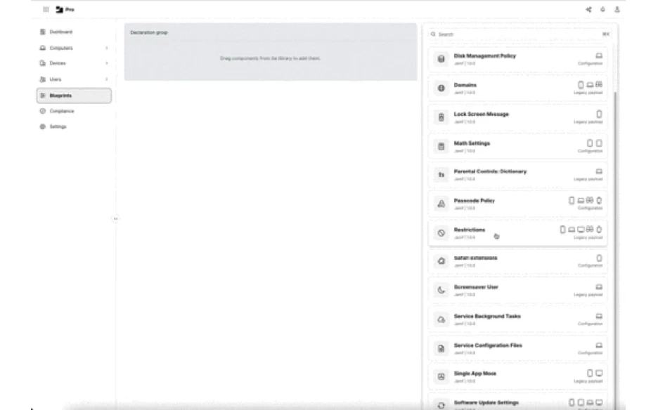 As part of Apple’s unveiling of Declarative Device Management (DDM) at WWDC 2023, Apple announced that DDM management included the ability to deploy MDM configuration profiles using DDM as the delivery mechanism in place of using MDM to deliver the profiles. Jamf Pro’s Blueprints leverages this capability to support device restrictions.