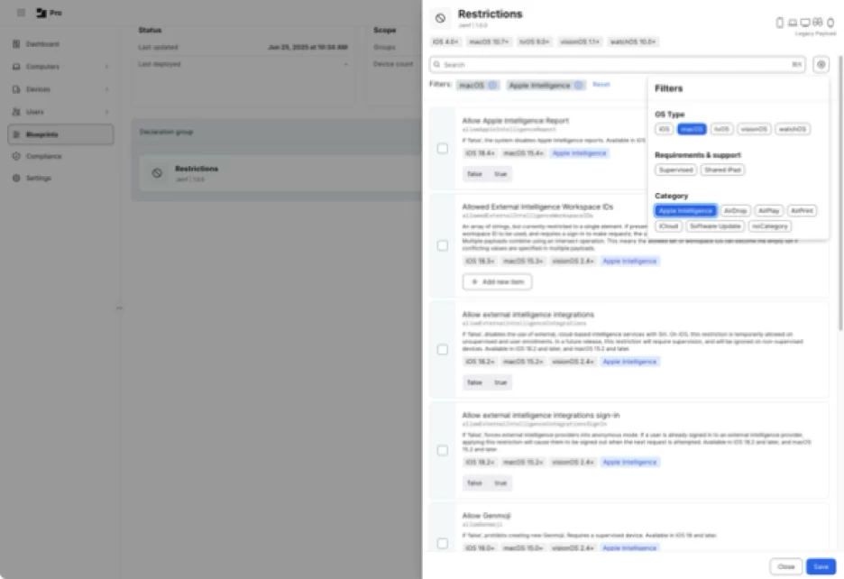8. At this point, you will see all available Restrictions settings which are available for all Apple platforms. To limit to only those options available for both macOS and Apple Intelligence, you can click the filter button and then select macOS in OS Type and Apple Intelligence in Category.