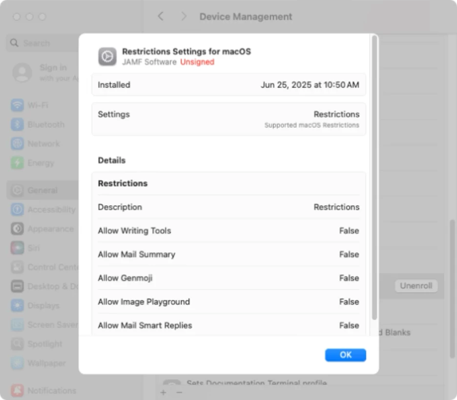 If you’re deploying an MDM configuration profile via Blueprints, you should see a Profiles section in Device Declarations. In the Profiles section, there is a listing with a name that matches the name of the blueprint which was deployed. In the case of our example, the listing shows Restrictions Settings for macOS.