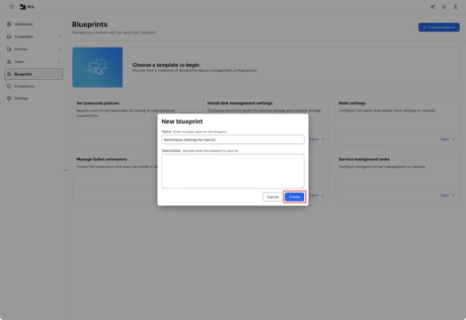 As of Jamf Pro 11.18.0, there is not a Blueprints template available for creating blueprints which manage device restrictions so the blueprint will need to be configured manually. To do this, use the following procedure: