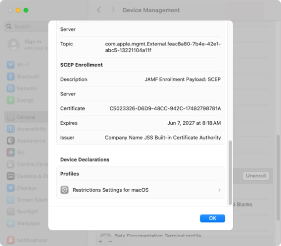 You can also check on the managed device’s end by opening System Settings: General: Device Management, locating the MDM enrollment profile in the list of profiles and double-clicking on it. When you scroll to the bottom of the enrollment profile’s window, you should see a Device Declarations section.