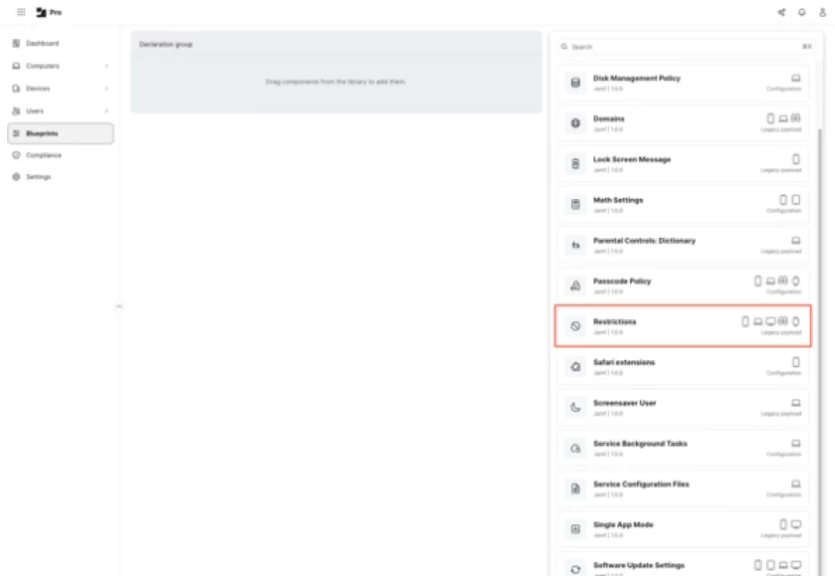 Note: The Restrictions component is listed as being the Legacy Payload type. In Blueprints, a Legacy Payload type indicates that this is an MDM configuration profile being delivered via DDM.