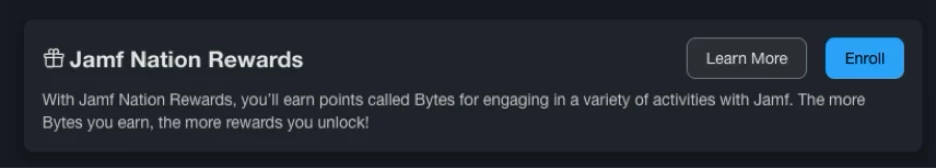 The best part? every Jamf customer can take part. If you’re thinking, wait… I haven’t earned anything yet? Just log into your Jamf account and enroll. From there, you’ll start collecting bytes for everything you already do. And while you’re at it, check out the rewards - from unique swag to free training, there’s plenty to choose from and new options keep landing.