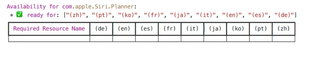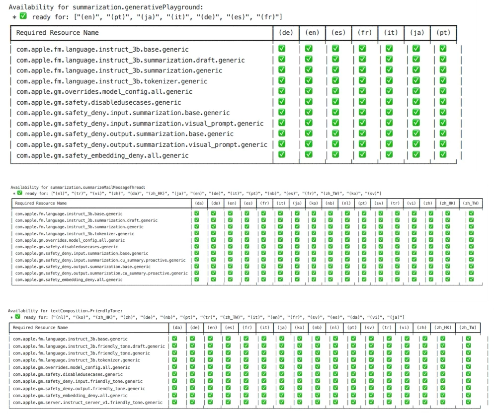 Each table lists required resources per language and you can see the models that are used… but most importantly you can see which features are on device or off device and shipped to Private Cloud Compute (PCC). Entries beginning with com.apple.gm.server indicate server-side involvement.