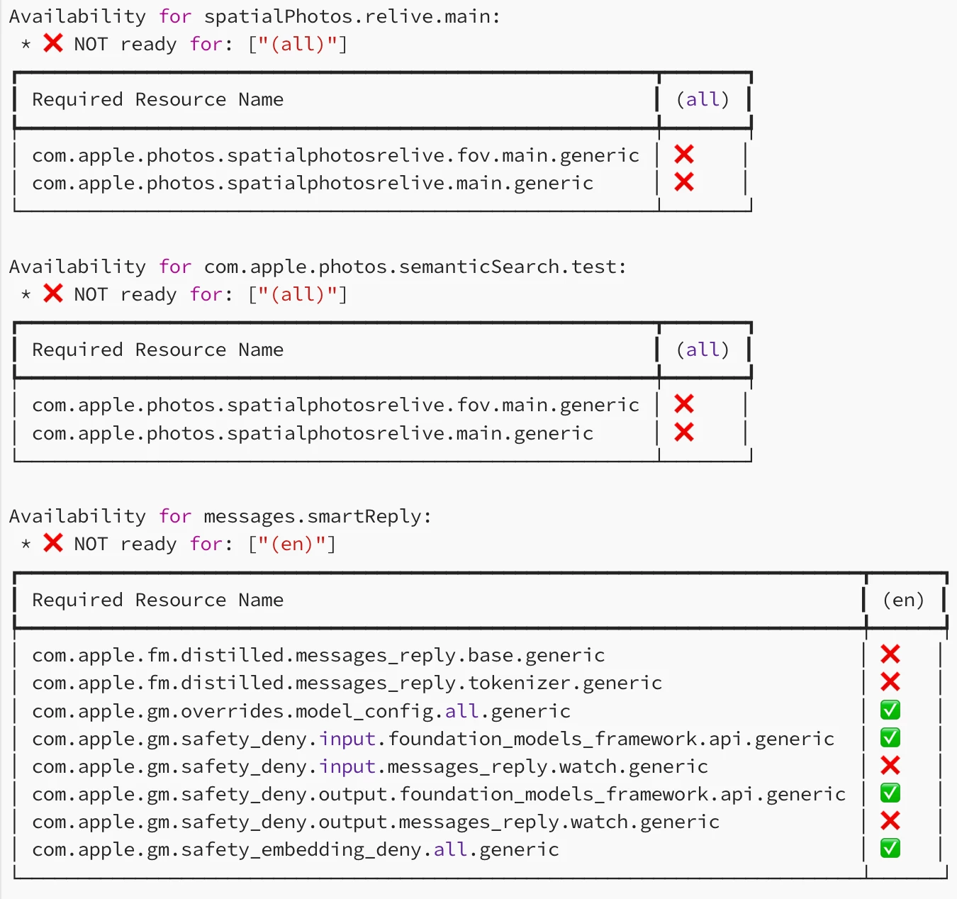 But what if… all that information was hiding on your very Mac in a system diagnostics, your Mac quietly generates a Model Catalog inside sysdiagnose that lists feature availability, languages, and — critically — which resources are server-side! For those that do not know, you can run a system diagnostics and explore the zip file created to potentially find some interesting tidbits about your Mac.