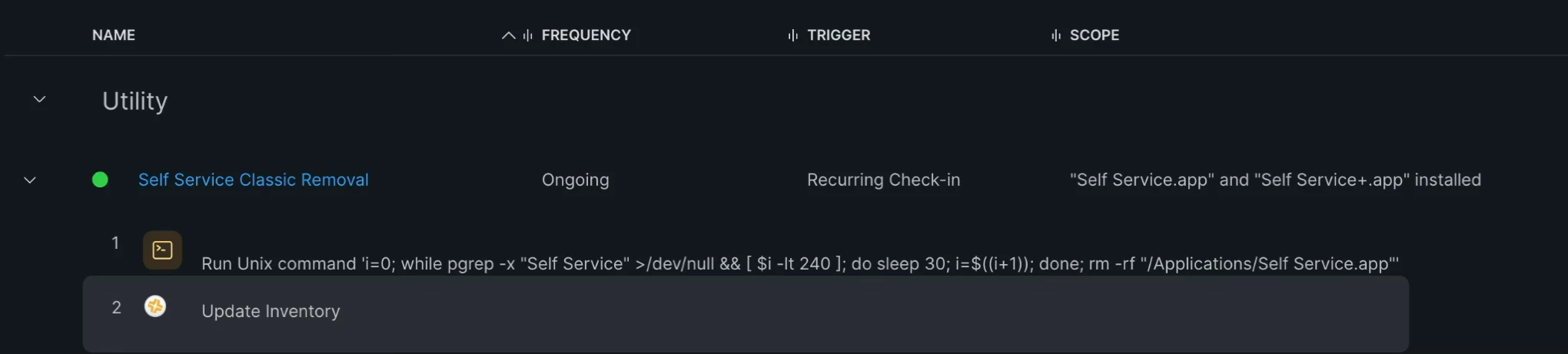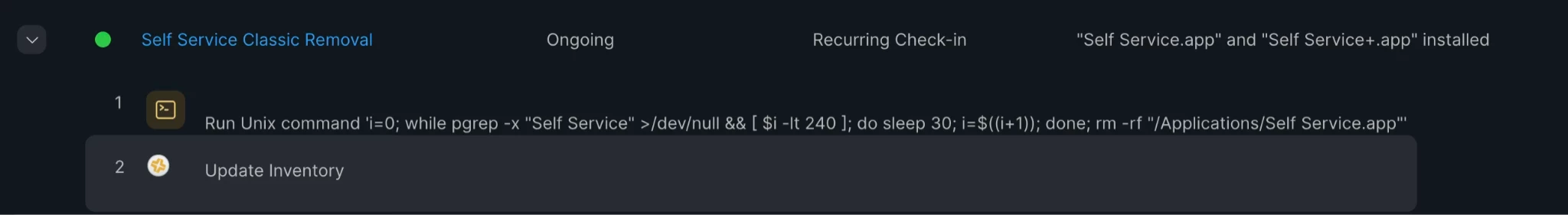 - Add the following in the command field in order To avoid removing the classic Self Service app while it is still running or during macOS Onboarding, wait until the application is no longer running before removing it (with 2 hours timeout):