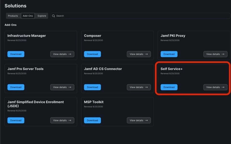 - Download the Self Service+ installer package from Jamf Account (Add-ons)