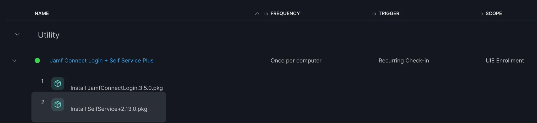 - Create a policy: “Install Self Service+ (UIE new enrollments)”