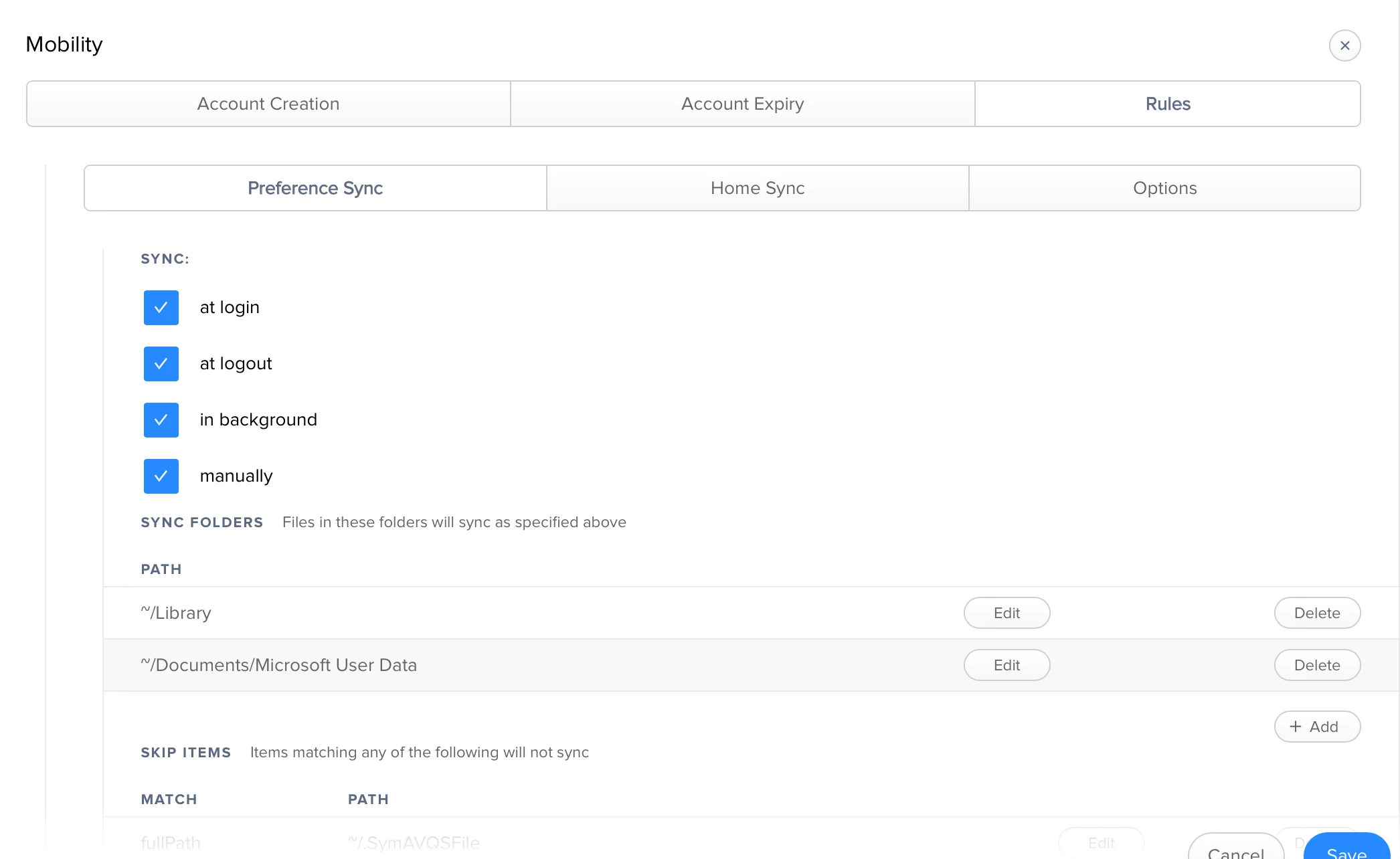 Under the Rules tab, there's some options for sync. I don't really understand what it's asking about at least in context to the mobile accounts. Can anybody shed some light on this or perhaps have a KB article for how to setup and use these config profile options?