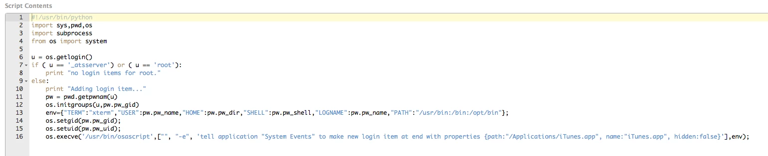 os.execve('/usr/bin/osascript',["", "-e", 'tell application "System Events" to make new login item at end with properties {path:"/Applications/iTunes.app", name:"iTunes.app", hidden:false}'],env);