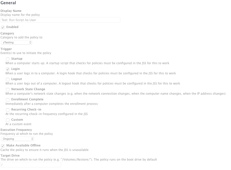 @jacob_salmela This appears to work just fine from terminal, but oddly enough it's not even trying to run at login. It's just showing pending. I can run it manually with "sudo jamf policy -id <POLICYID>" and it works though. Here are screens of how the policy is setup: