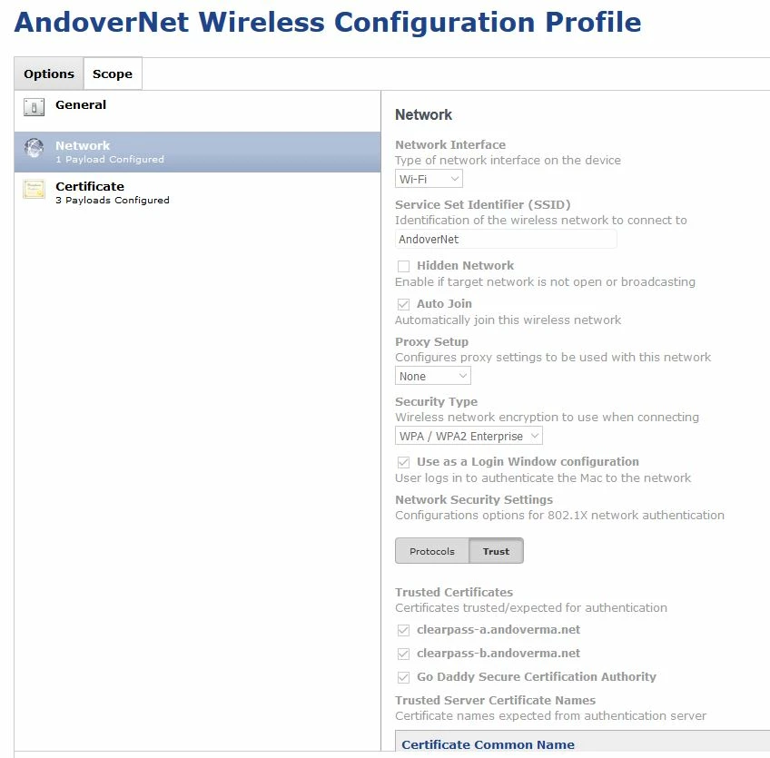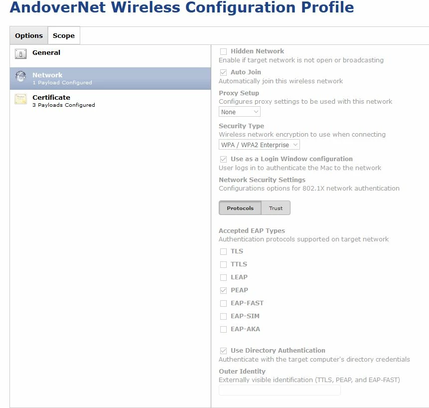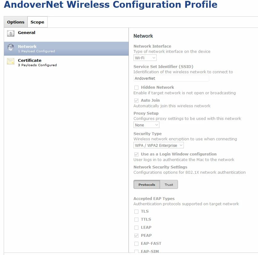 I'm attaching screen shots of my WiFi Configuration profile. Maybe we have a setting set incorrectly? Any help would be appreciated.