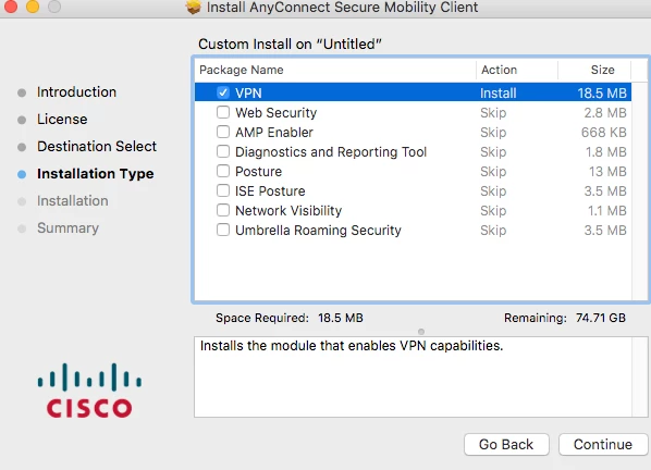 however, the installation has several options to select from: vpn, web security, amp enabler, and so on.